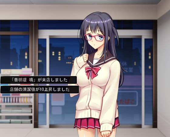 店側のパラメータにある『清潔』の値が低いとモブキャラ共による万引き率が高まって、どんどん所持金が削られていってしまうので注意。ヒロインが万引きする確率と『清潔』は関係が無いので、とにかく店の方は『清潔』を高く保っておくのが吉です。