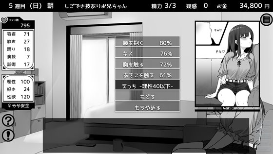 アイドルを目指すさくらちゃんを育成すると同時にさくらちゃんの『理性』を削ることでエッチエッチな展開に持ち込めます。