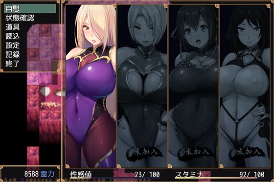 画面上端に『発情値』『累積媚毒』『淫乱経験値』等の項目が表示されていて(非表示可)、ダンジョン内を歩き回っているだけでもどんどん上昇していっちゃいます。